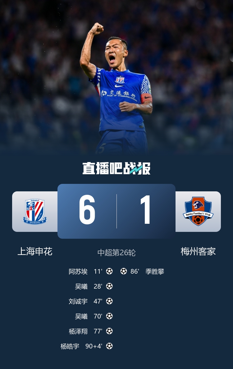 下半場(chǎng)補(bǔ)時(shí)7分鐘。最終全場(chǎng)比賽結(jié)束,上海申花6-1梅州客家。