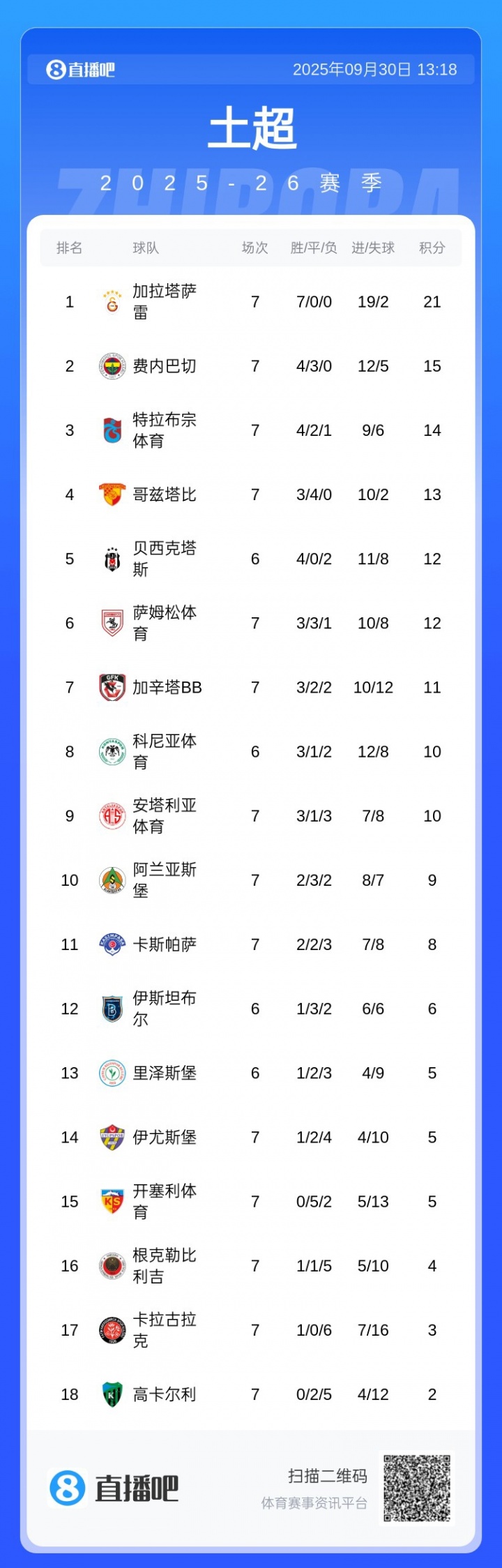 加拉塔薩雷本賽季在土超7場全勝領(lǐng)跑,進(jìn)19球僅丟2球。