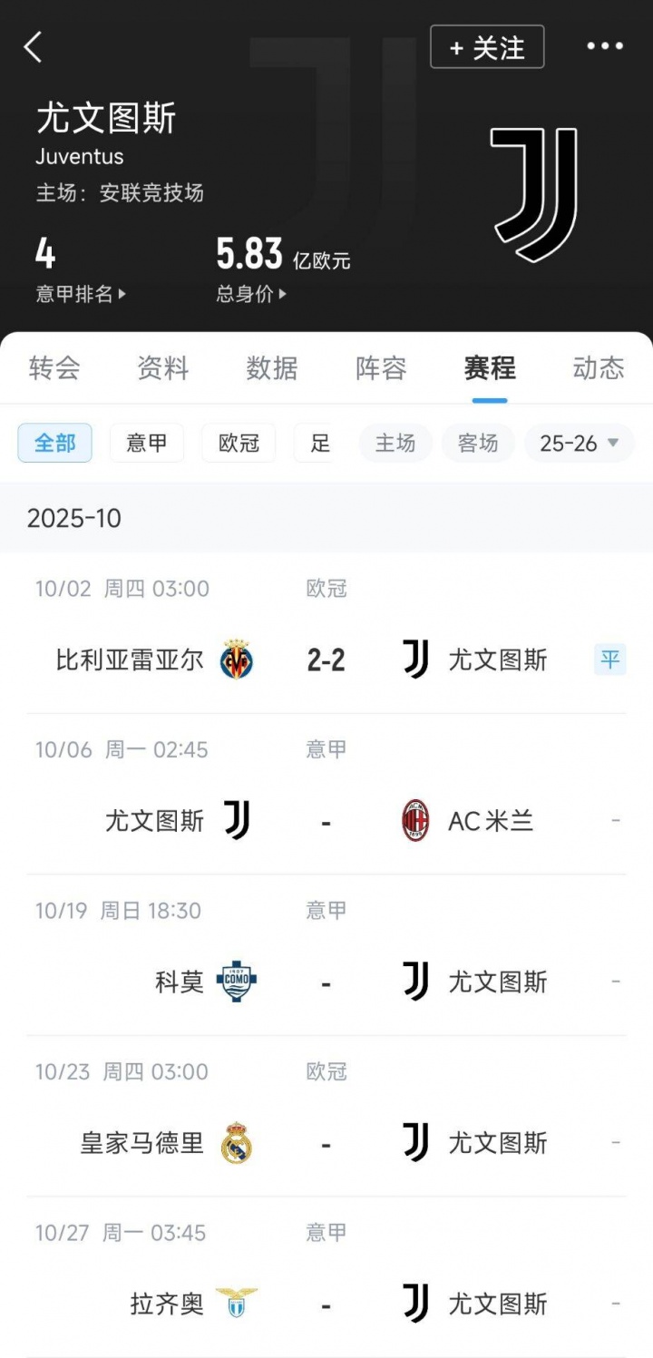 10月02日訊 歐冠比賽,尤文2-2遭比利亞雷亞爾絕平,各項賽事4連平,新賽季開始至今不敗。