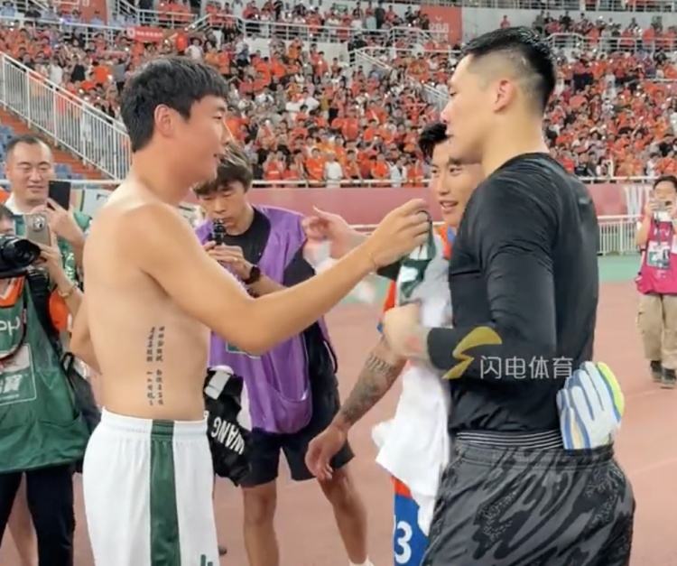 今晚中超第23輪的京魯大戰(zhàn),泰山主場6-0大勝國安。賽后,李磊和王大雷在場邊相互擁抱并交換了球衣。