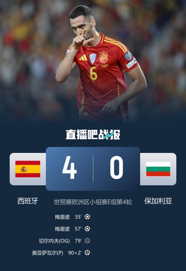 西班牙4-0保加利亞四連勝領(lǐng)跑 梅里諾雙響+造點(diǎn)奧亞薩瓦爾點(diǎn)射