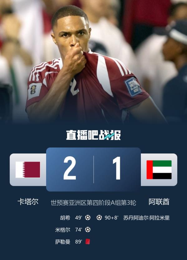 世預(yù)賽亞洲區(qū)第四階段A組第3輪,10人卡塔爾2-1戰(zhàn)勝阿聯(lián)酋,晉級(jí)2026年世界杯正賽。